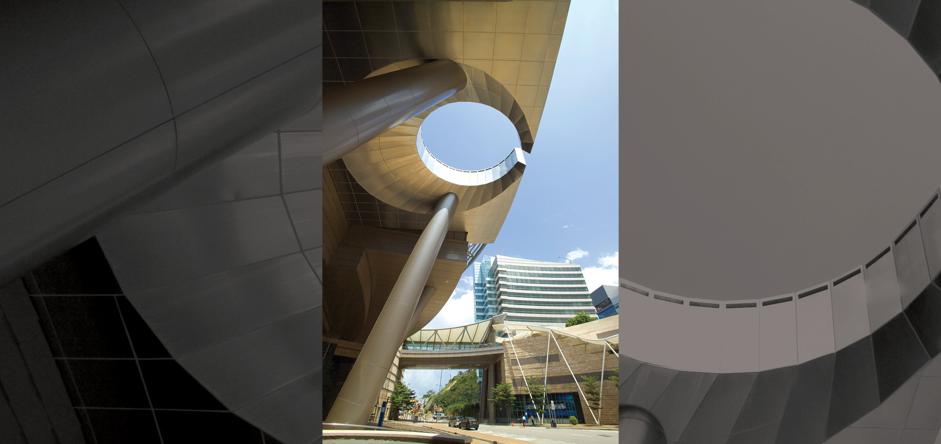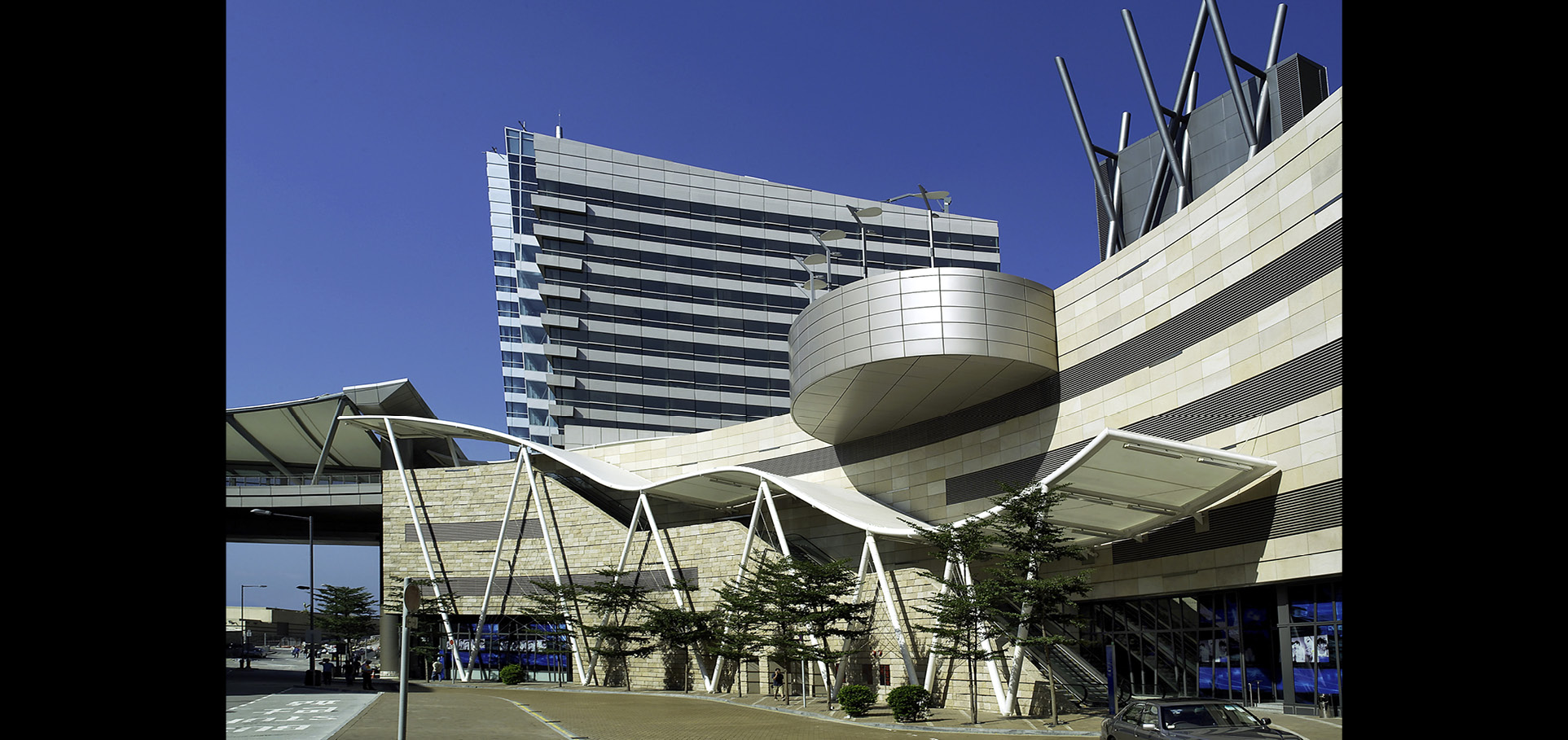 Spherical in shape with flowing curves which wrap round its perimeter, the Cyber Mall (or “The Arcade”) is constructed of long-span radial steel structures, supported by inclined structural columns and covered by ETFE fabric roofing – the same type used at the Millennium Dome in London, the construction of the mall at the time was a real challenge.