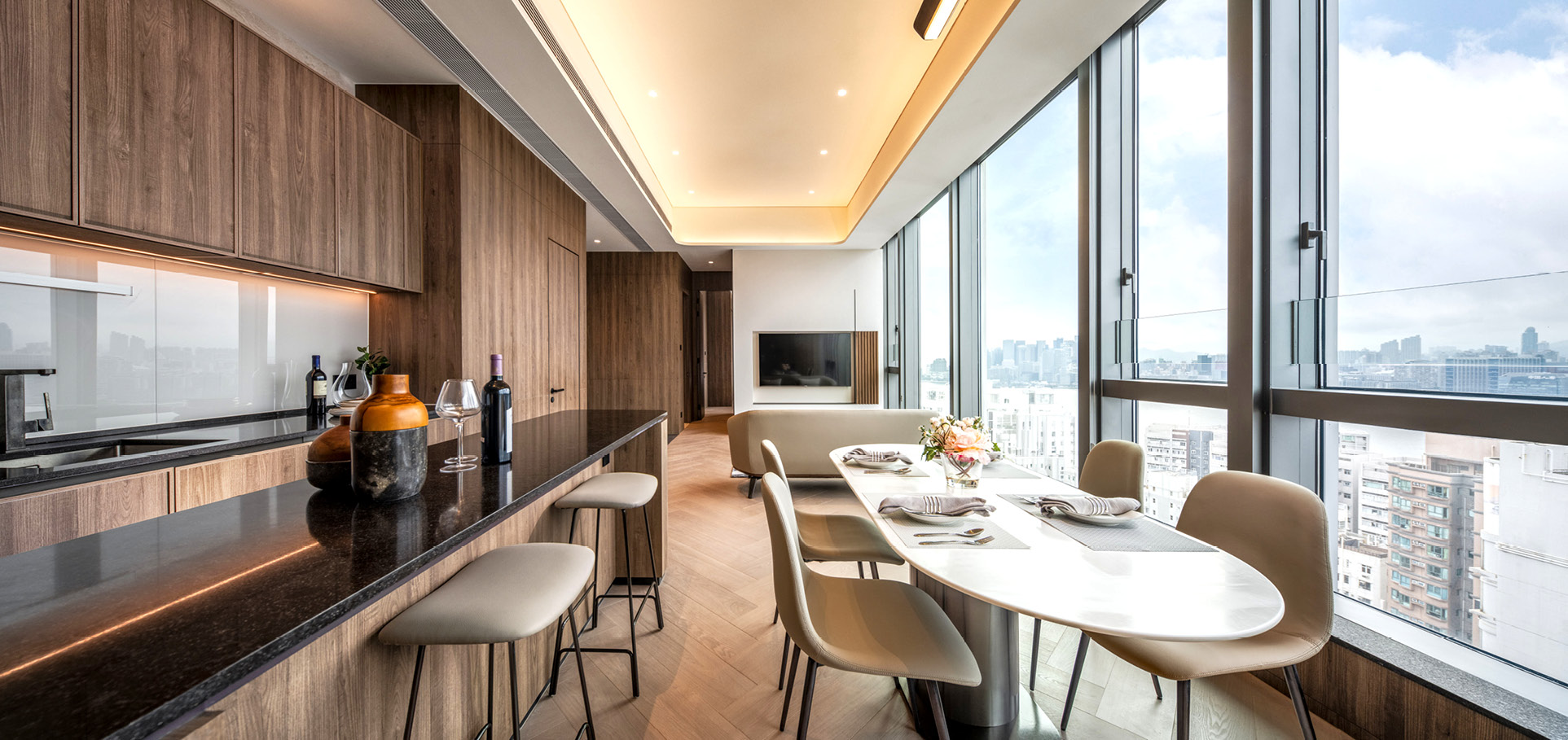 The guestroom interior design also emphasizes the cube geometry, utilizing furniture and feature light design. The primary goal is to create a soothing and calming atmosphere for the guests. Natural colours and patterns, such as natural wood/timber, are used in the guestroom entrance foyer and bedroom area. Soft fabrics are selected for loose furniture like stools and sofas to enhance the sense of softness and harmony. The guestroom design features a focal point design with a juxtaposing feature wall and textured paint that resembles light shimmers, completing the journey of the "sugar crystal" theme from exterior to interior.