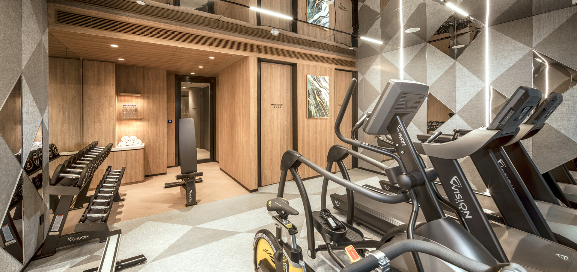 The 1/F (L2) Lounge and Common Pantry showcase a double storey Lounge with a 7m tall glass wall, creating a strong visual connection between the interior and exterior. The Lounge serves multiple functions as a waiting area, dining space, and social hub. The interior design features lounge sofas, coffee tables near the reception area, bar tables, dining tables, and chairs to cater to diverse needs and provide privacy. A well-designed common pantry is equipped with six self-serving cooking stations, providing ample preparation areas, induction hobs, exhaust hoods, and steam ovens. The goal is to offer guests a comfortable, convenient, and enjoyable cooking experience during their stay. The gym exudes energy and positivity, featuring a mirror-finish ceiling, vinyl carpet wall pattern, and light-coloured plastic laminate. Natural lighting on the mirror ceiling enhances the brightness and amplifies the space in the gym room.