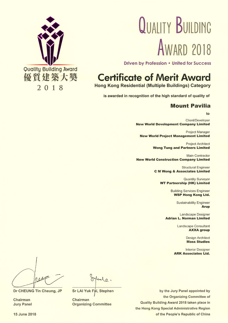 Mount Pavilia receives Quality Building Award 2018 – Certificate of Merit Award, Hong Kong Residential (Multiple Buildings) category.