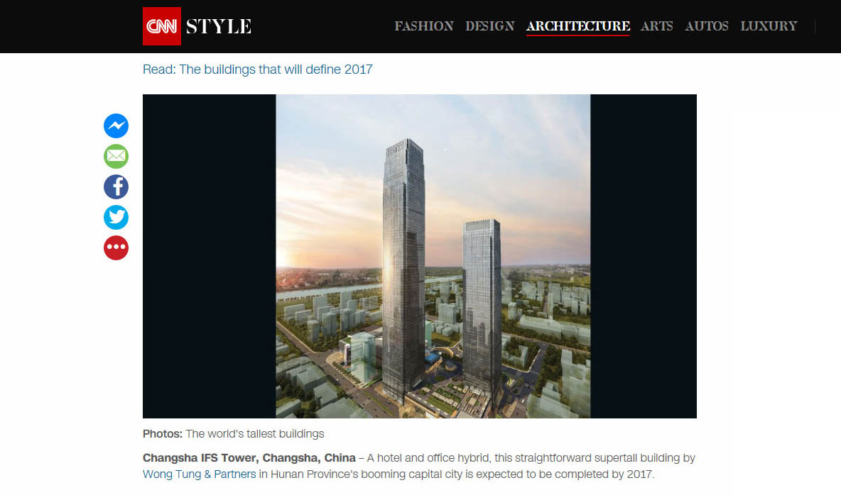 Changsha IFS Tower, Changsha, China – A hotel and office hybrid, this straightforward supertall building by Wong Tung & Partners is Hunan Province’s booming capital city is expected to be completed by 2017.