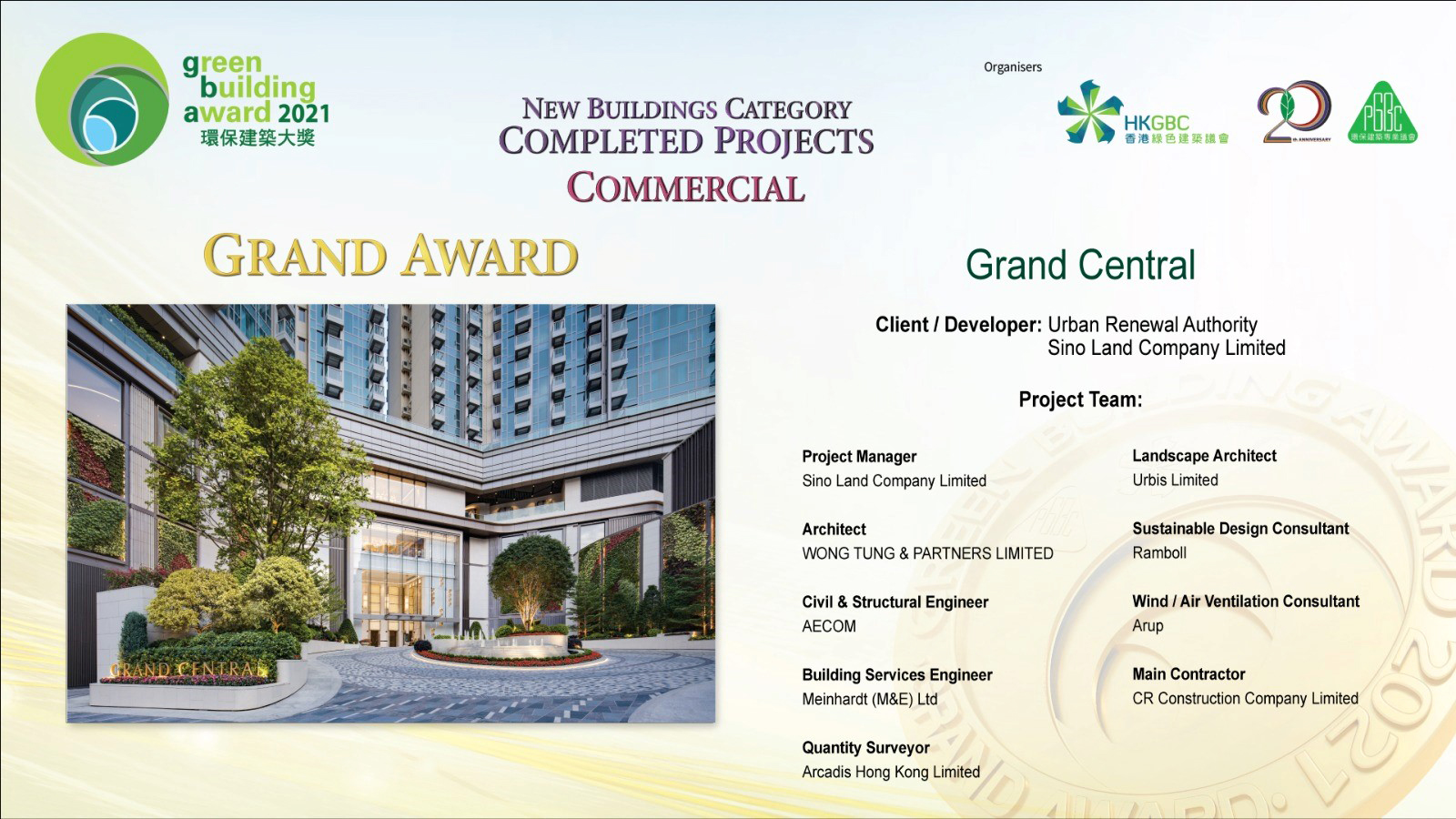 We are pleased to announce that the Green Building Award 2021 – Grand Award (New Buildings Category Completed Projects -Commercial) has been awarded to our project, GRAND CENTRAL. The annual Green Building Award is jointly organized by the Hong Kong Green Building Council and the Professional Green Building Council.