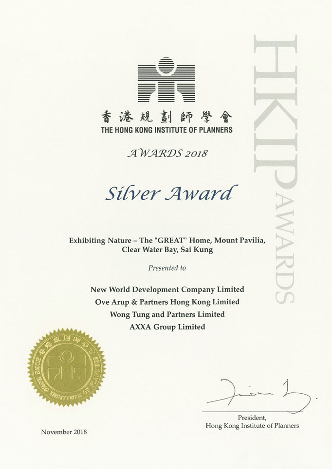 Mount Pavilia a residential development consists of villas with a mix of triplex, duplex units and 4 to 7-storey apartments, located in Sai Kung, Hong Kong. Receives Silver Award from HKIP; The Hong Kong Institute of Planners.